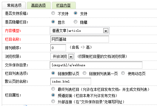 再来说说文档模板,在常规选项->栏目属性处看到。作为频道封面栏目不能发布文章的。那我们选一个最终列表栏目,如”Html”